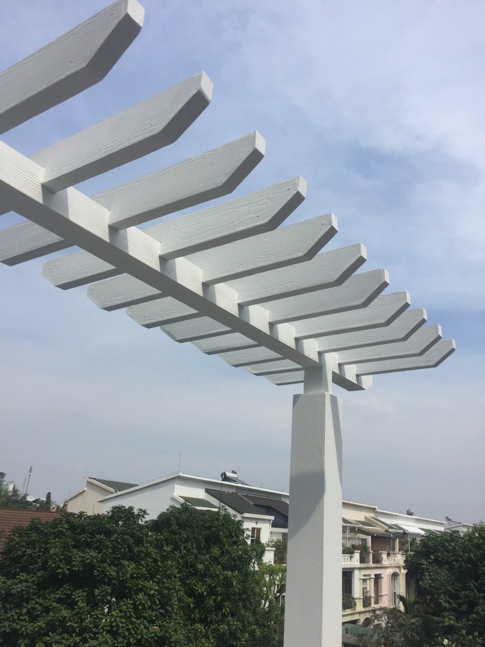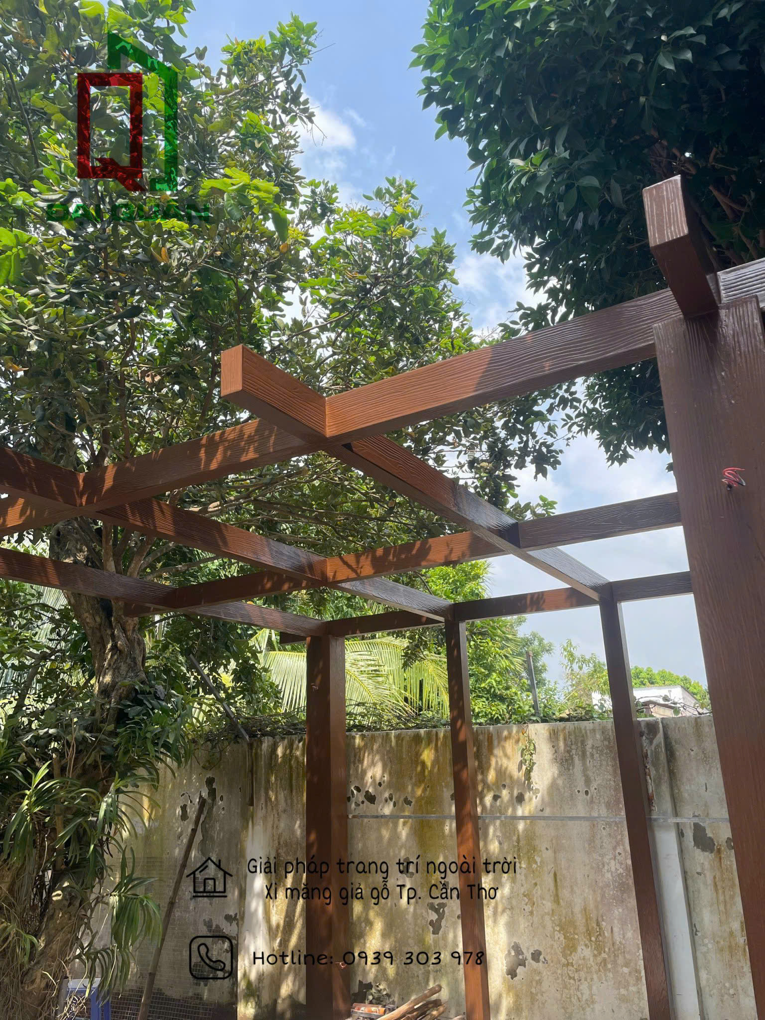 Khung Pergola được làm từ sắt hộp sơn tĩnh điện chống gỉ, bên ngoài ốp tấm xi măng giả gỗ cắt chuẩn, bo cạnh sắc nét. Sự kết hợp này giúp công trình vừa nhẹ, vừa chắc, chịu được nắnưa quanh năm.